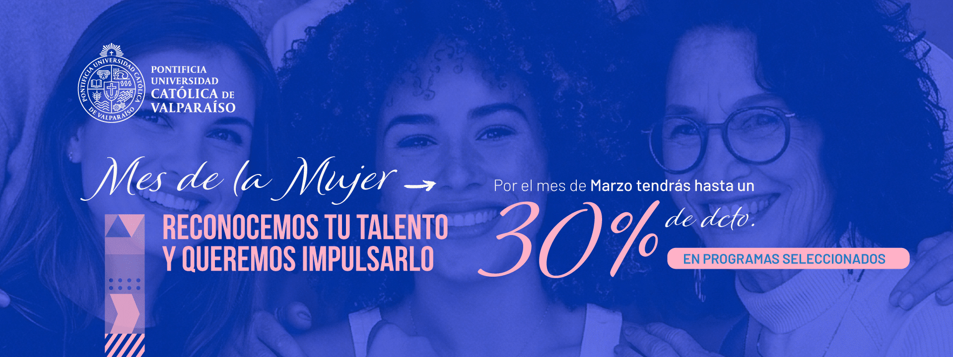 En el marco del mes de la mujer, la Pontificia Universidad Católica de Valparaíso, a través de su Dirección de Formación Continua, lanzó la campaña “Marzo: Mujeres que Lideran”, iniciativa que contempla un beneficio especial acumulable en diplomados, cursos y postítulos seleccionados durante todo el mes de marzo.